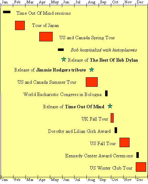 What a year this was! Again! A new album recorded and released, a near fatal illness, playing for the Pope, receiving the JFK Award, touring continues in the same frantic pace as before. Dylan performs a total of 95 dates in 1997, including the Beverly Hills, Bologna and San Jose gigs. Practically all these performances are highly praised by both fans and critics and this despite a life-threatening illness, the recording and promotion of a major new album and other distractions, an absolutely astounding achievement.